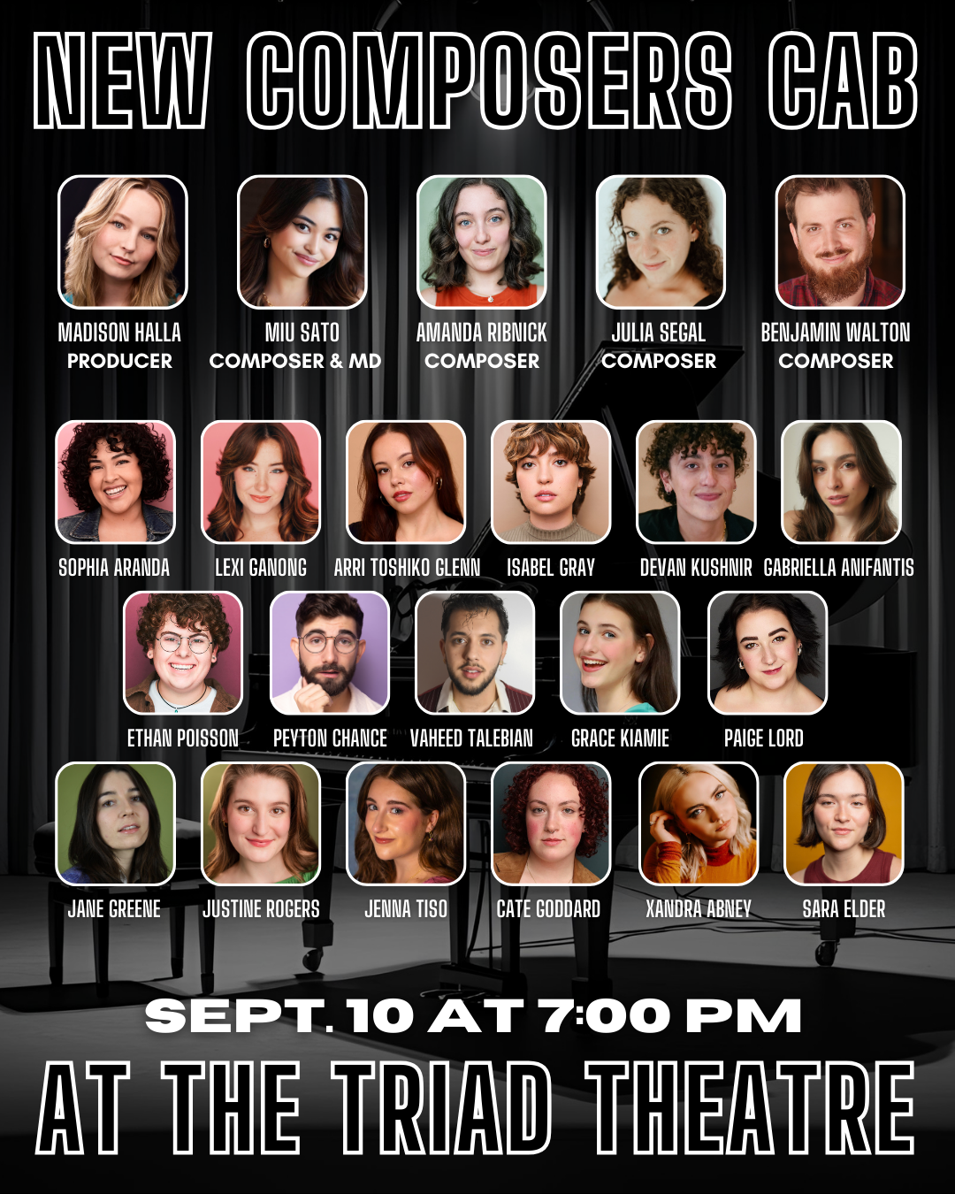 madison halla has put together a cabaret showcasing the works of new musical theatre composers such as myself, julia segal, amanda ribnick, and miu sato. it’s on wednesday, september 10th from 7 to 8:30 at the triad theater, tickets are around $20 and can be purchased here. the cabaret will have a large cast of performers, and songs will be accompanied by a full rhythm section band. i’ll be doing three songs from three different shows of mine (i’m in love with bigfoot, monster, and tame the noise)